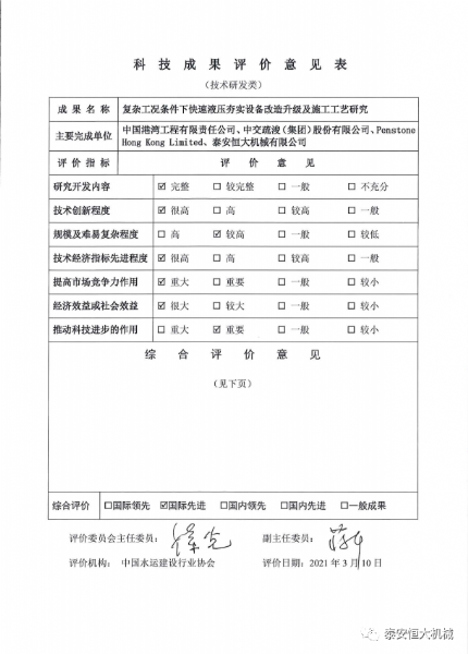 2021年3月10日,中國水運(yùn)建設(shè)行業(yè)協(xié)會在北京主持召開了由中國港灣工程有限責(zé)任公司、中交疏浚(集團(tuán))股份有限公司、中交第四航務(wù)工程勘察設(shè)計院有限公司、Penstone Hong Kong Limited和泰安恒大機(jī)械有限公司共同完成的“復(fù)雜工況條件下快速液壓夯實設(shè)備改造升級及施工工藝研究”科技成果評價會,評價委員會(名單附后)聽取了項目組的匯報,審閱了研究報告、科技查新報告和應(yīng)用證明等材料。
